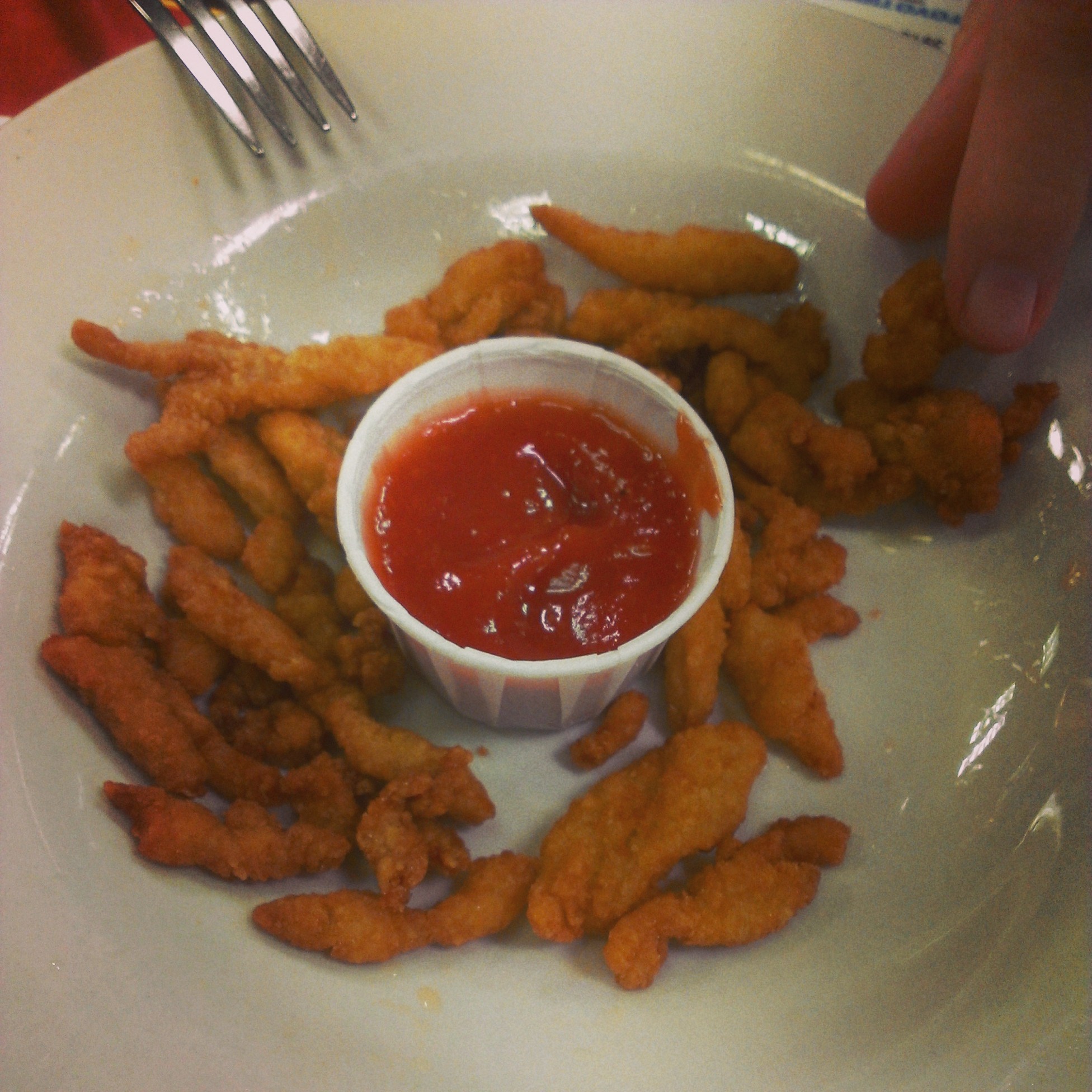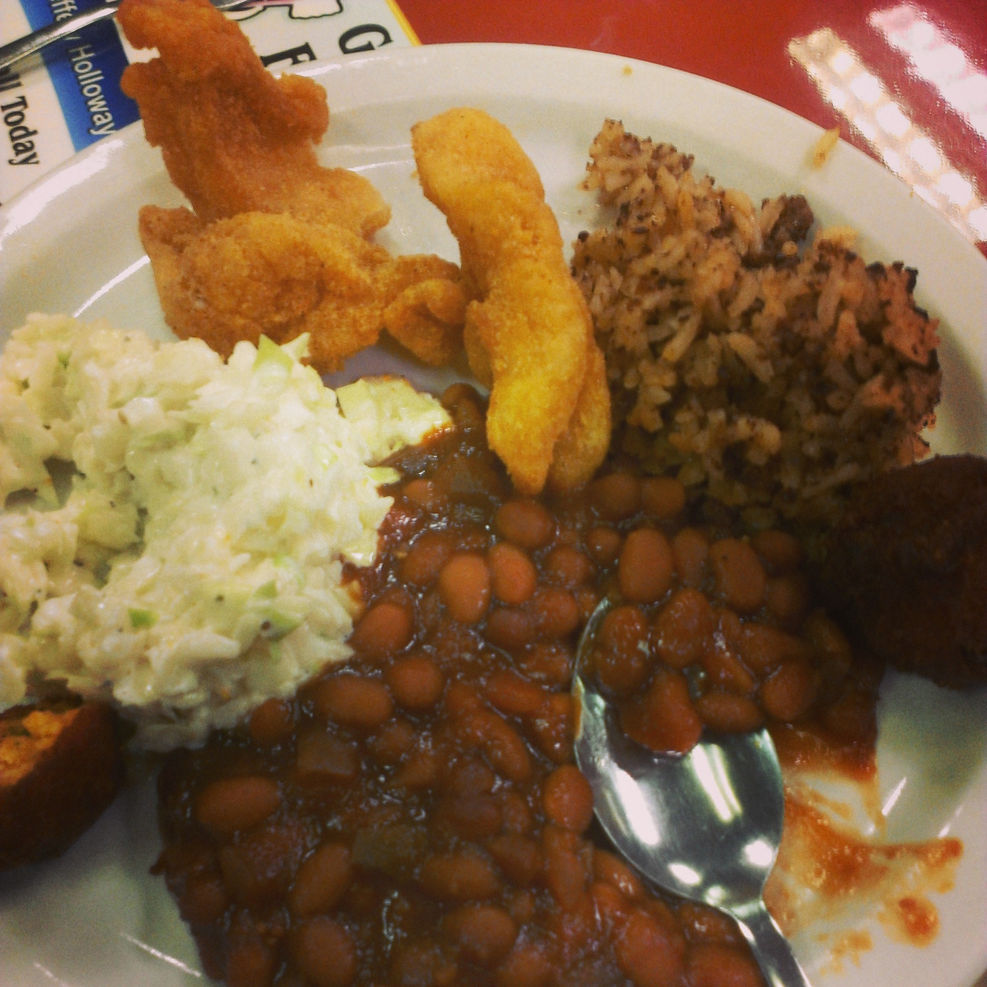 IMG_20140126_180619The catfish dinner is the menu “must have”. My daughter insisted on ordering the adult sized platter and put away all six pieces of fish. Please note there is no oily residue on the plate.