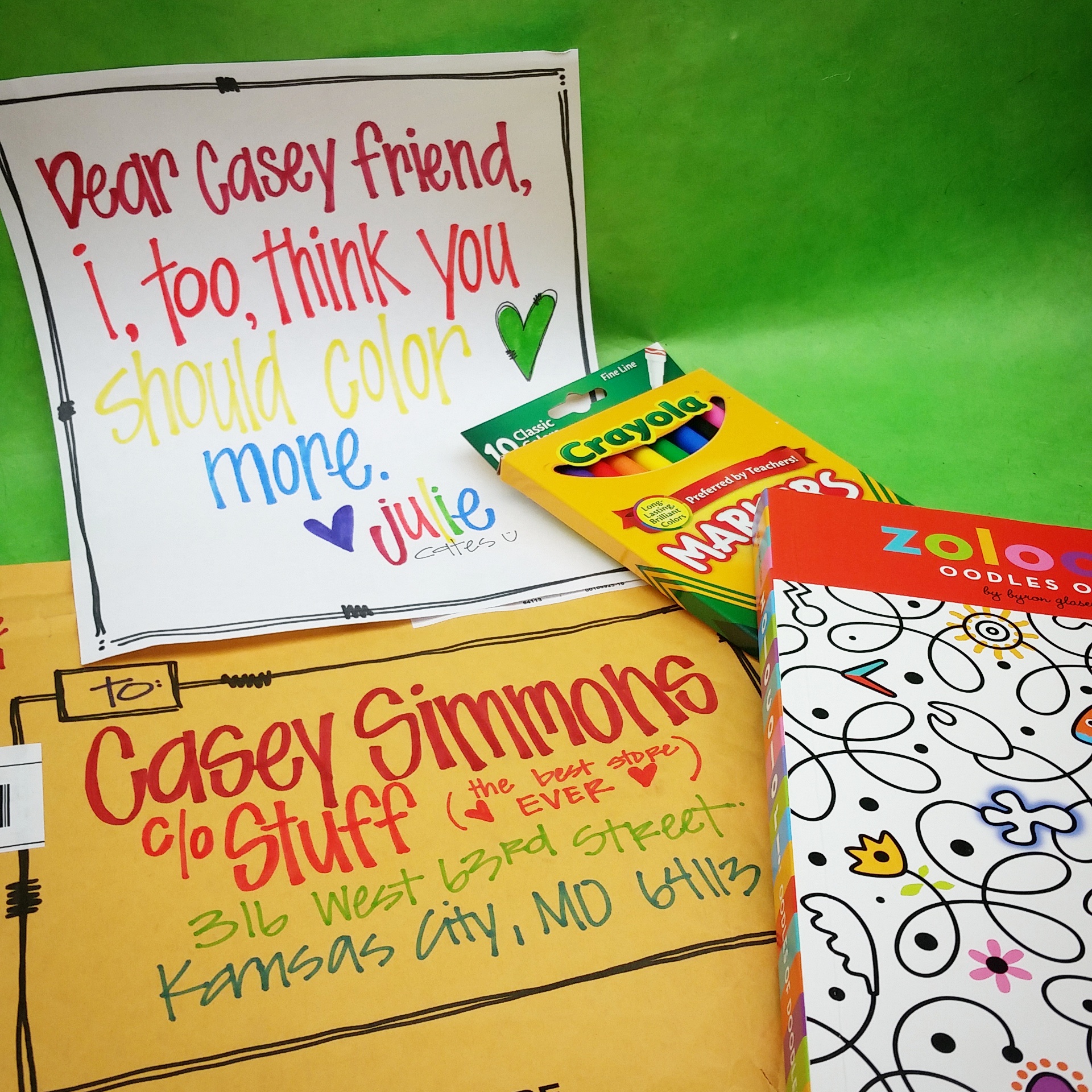 I had re-posted on Facebook an article about a recent study that found that coloring is good for adults. You can read about it here at the Huffington Post. Julie Cates, an accomplished artist and friend, had responded. And, I believe, that was where the seed for this deeply appreciated gift was planted.